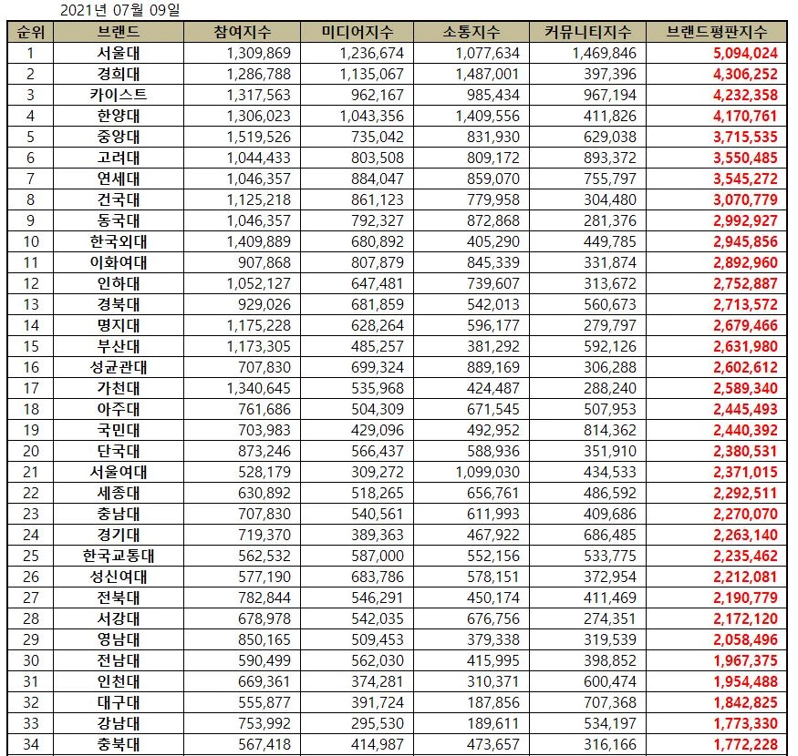 대학교 브랜드평판 상위 20위는 서울대, 경희대, 카이스트, 한양대, 중앙대, 고려대, 연세대, 건국대, 동국대, 한국외대, 이화여대, 인하대, 경북대, 명지대, 부산대, 성균관대, 가천대, 아주대, 국민대, 단국대 순으로 분석됐다.
