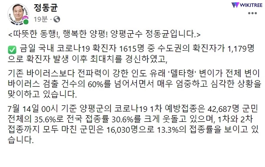 정동균 양평군수는 14일, "전파력이 강한 인도 유래 '델타형' 변이가 전체 변이 바이러스 검출 건수의 60%를 넘어서면서 매우 엄중하고 심각한 상황을 맞이하고 있다"는 글을 자신의 페이스북에 게시했다.