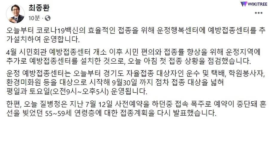 최종환 파주시장은 14일 오후, "오늘부터 운정행복센터에 예방접종센터를 추가설치하여 운영한다"는 글과 함께 연령대별 백신계획을 알렸다.