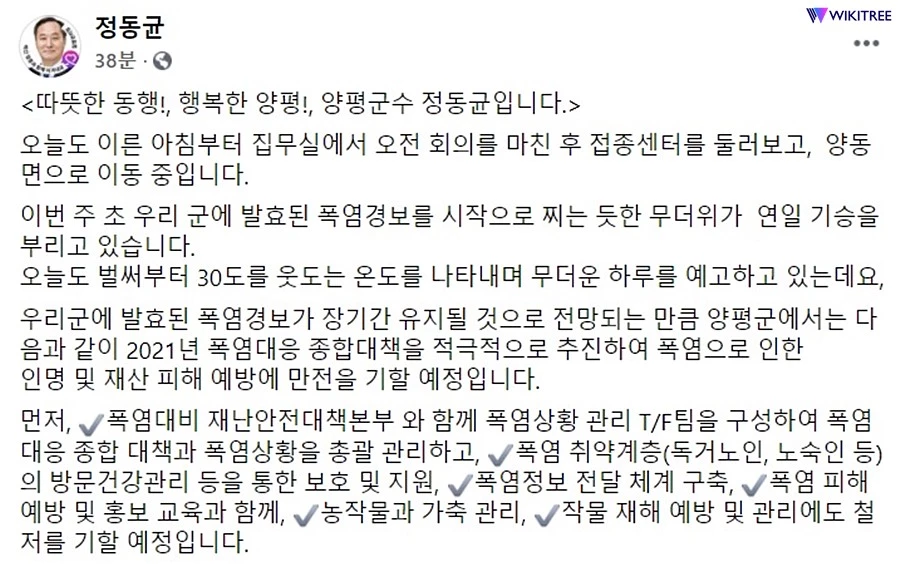 정동균 양평군수는 15일 오전, 연일 이어지는 찜통 더위에 '양평군 폭염대응 종합대책을 추진하겠다'는 글을 자신의 페이스북 계정에 올렸다.