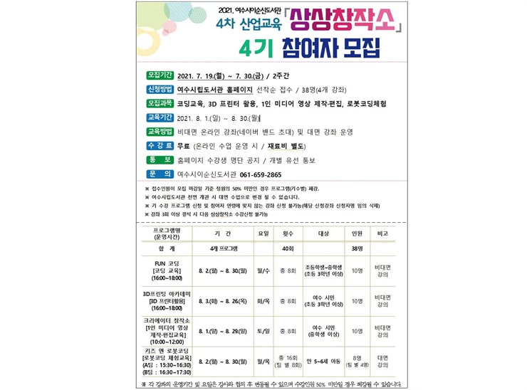 여수시(시장 권오봉)가 시민들이 다양한 미래 4차 산업 기술을 체험하고 배울 수 있도록 이순신도서관 4차 산업교육 ‘상상창작소’ 4기에 참여할 시민을 선착순 모집한다.