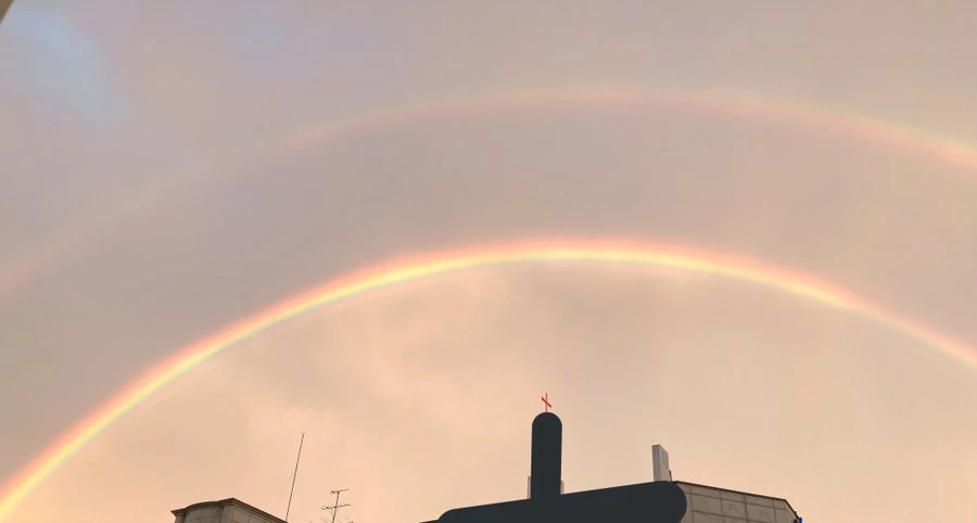 보라색과 분홍색이 아름답게 섞인 하늘에는 선명한 쌍무지개가 떴다. 쌍무지개는 대기 중에 있는 빛이 두 번에 걸쳐 굴절과 반사가 이뤄지면서 나타나는 현상이다.