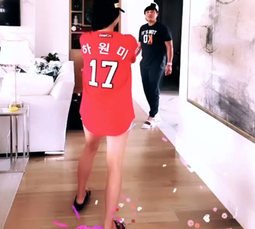 하원미는 19일 자신의 인스타그램에 사진 여러 장을 올렸다. 그는 자신의 이름이 등에 새겨진 야구 유니폼을 입고 남편 추신수를 반갑게 맞이했다.