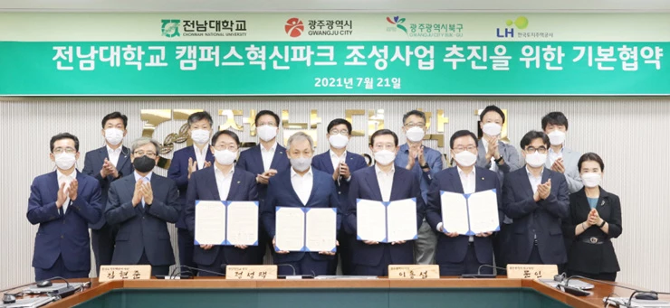 전남대는 7월 21일 대학본부에서 정성택 전남대 총장과 이용섭 광주광역시장, 문인 북구청장, 김현준 한국토지주택공사(LH) 사장이 참석한 가운데, ‘캠퍼스혁신파크 조성사업 추진을 위한 기본협약’을 체결하고, 각 기관별 역할분담과 상호협력을 위한 사항을 구체화했다.