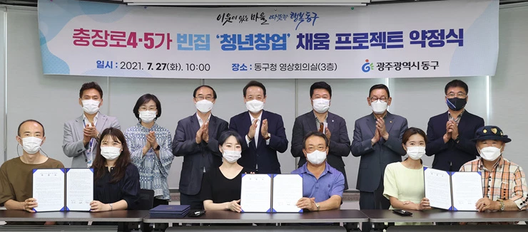 광주시 동구(청장 임택)는 27일 3팀의 청년 창업자와 빈집 소유주 간의 ‘충장로4·5가 빈집 청년창업 채움 프로젝트’ 2차 약정식을 개최했다고 밝혔다.