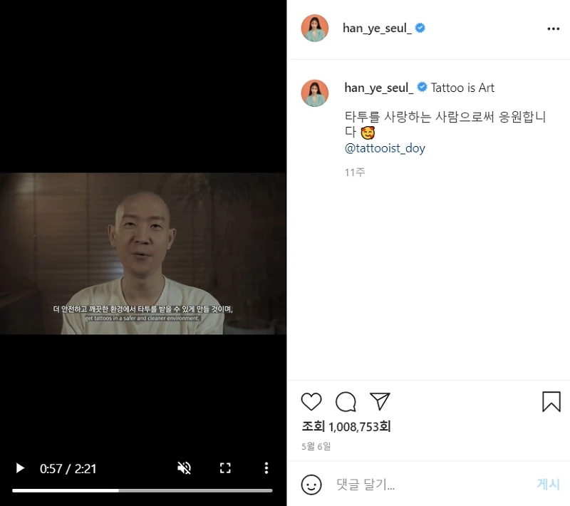 그는 또 지난 5월에 한국 타투유니온지회 지회장 타투이스트 도이 김도윤의 영상을 공유하며 “Tattoo is Art. 타투를 사랑하는 사람으로써 응원합니다”라는 문구를 작성하기도 했다.