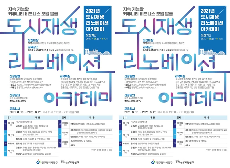 광주 동구(청장 임택)는 도시재생에 대한 이해를 바탕으로 지역에서 사업을 주도적으로 추진할 역량 있는 주민리더 및 활동가 양성을 위해 ‘2021년 도시재생 리노베이션 아카데미’ 참여자를 오는 8월 4일까지 모집한다고 밝혔다.