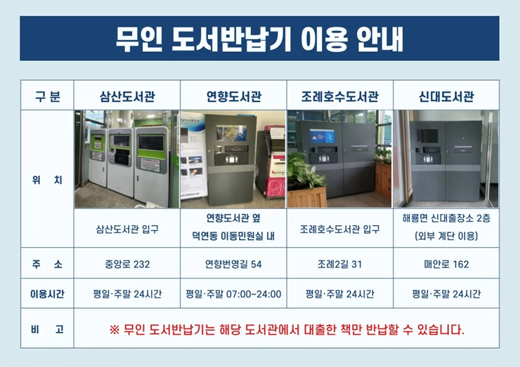 무인도서반납기는 4개 도서관(삼산, 조례, 신대, 연향)에서 운영 중이며, 24시간 이용가능(연향도서관은 07:00~24:00까지 이용가능)하다. 다만 해당도서관 책만 반납할 수 있다.