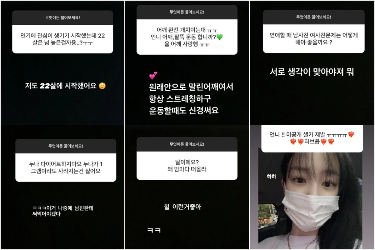 그러면서 이유비는 '남자친구가 헤어지재요'라는 팬의 고민에는 "헤어집시다. 미련 뚝"이라고 단호한 조언 글을 남겼다. '22살에 연기에 관심을 가지게 됐는데 늦은 거냐'라는 물음에 "저도 22살에 시작했다"는 답변으로 용기를 북돋웠다. 이 외에도 미공개 셀카, 사용하는 화장품 등을 공유하며 남다른 팬 사랑을 뽐냈다.