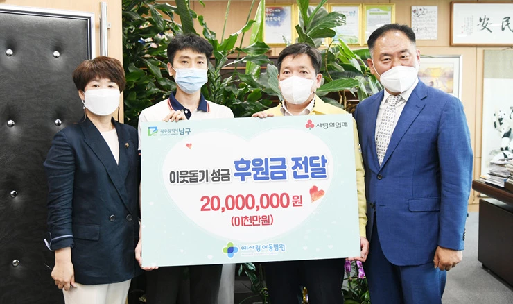 광주 남구 진월동 소재 예사랑아동병원(대표 원장 이수야) 관계자들은 최근 남구청을 방문, 관내 어려운 이웃을 돕기 위한 성금 2천만원을 김병내 남구청장에게 전달했다./광주시 남구
