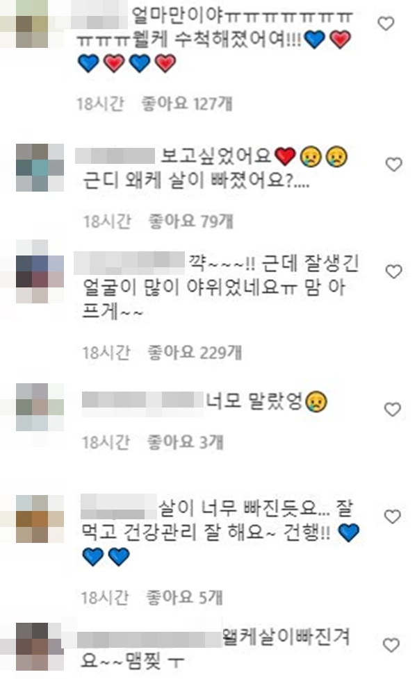 네티즌들은 "얼마 만이야. 왜 이렇게 수척해졌어요", "보고 싶었어요. 근데 왜 이렇게 살이 빠졌어요?", "근데 잘생긴 얼굴이 많이 야위었네요. 마음 아프게", "너무 말랐어", "살이 너무 빠진 듯... 잘 먹고 건강관리 잘해요", "왜 이렇게 살이 빠진 거야 마음 아프게" 등 댓글을 남겼다.