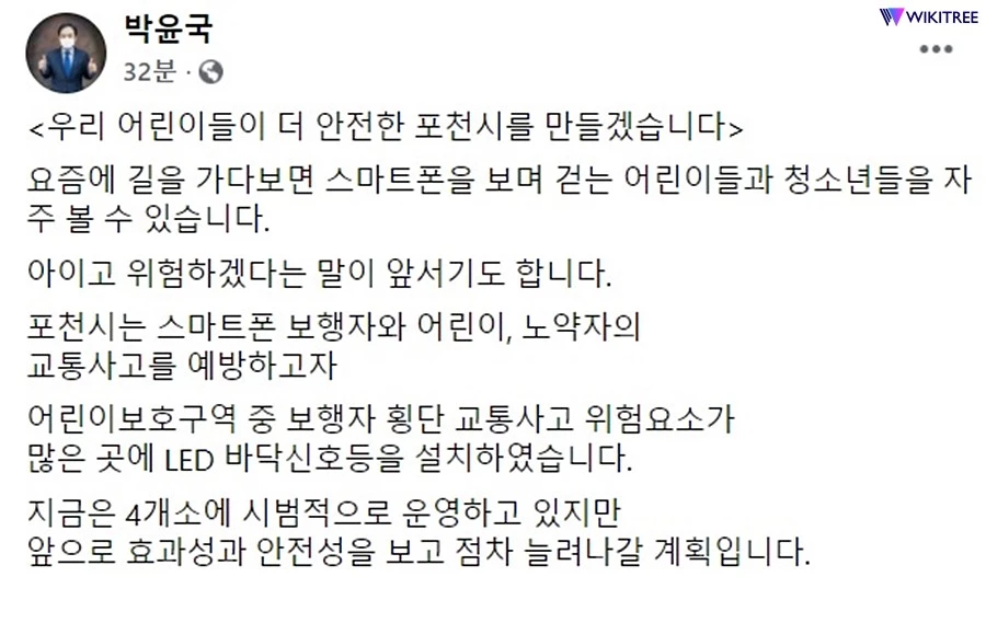 박윤국 시장은 "우리 어린이가 한 명도 다치지 않도록 교통안전망을 촘촘히 만들어 나가겠다"면서 "어린이들이 웃을 때 비로소 우리 모두가 웃을 수 있다. 한걸음 한걸음 안전이라는 희망을 키우겠다"고 밝혔다.