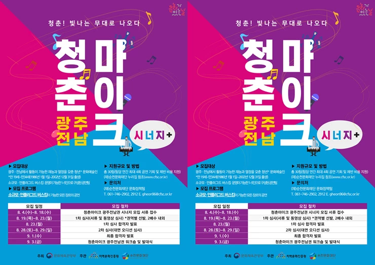 한편, 2021 문화가 있는 날 <청춘마이크>는 문화체육관광부가 주최하고 (재)지역문화진흥원과 (재)순천문화재단이 공동 주관하는 사업으로 재능 있는 청년예술가에게는 ‘문화가 있는 날’ 공연 기회와 재정 지원을 통해 성장 발판을 제공하고, 광주‧전남 시‧도민들에게는 일상에서 친근하게 무대를 만날 수 있도록 문화향유기회를 제공하고 있다.