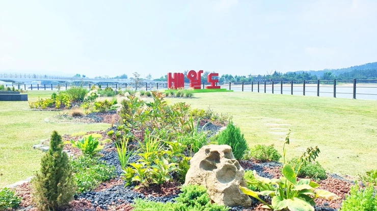 초록 잔디가 융단처럼 펼쳐진 섬 마당은 소박한 꽃밭과 배알도라는 빨간색 명칭 조형물로 꾸며져 낭만과 감성을 자극한다.