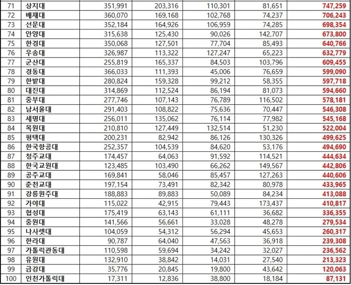 다음은 '8월 대학교 브랜드평판' 1위부터 100위까지 정리한 표다.
