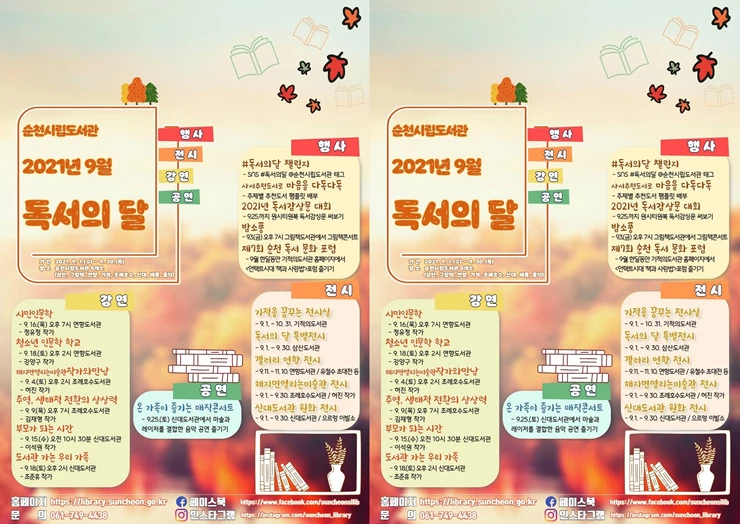 순천시 도서관 관계자는 “독서의 달을 맞이하여 독서의 중요성을 알리고 도서관 이용을 적극 권장하고 싶은 마음으로 도서관 행사를 준비했다.”며 “다채로운 행사 구성으로 시민들이 책과 더 가까워지는 시간이 되었으면 한다.”고 전했다.