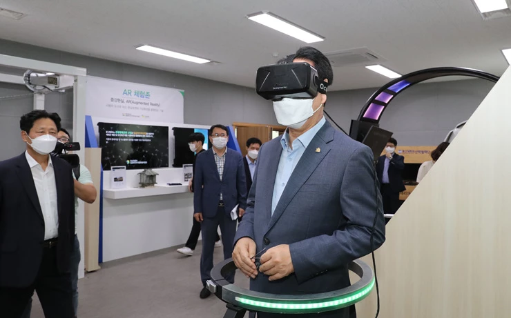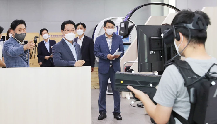 12일 김영록 전라남도지사가 전남정보문화산업진흥원 아카이빙 체험실에서 허기택 동신대 교수로부터 실감콘텐츠에 대한 설명을 듣고 시연을 하고 있다.