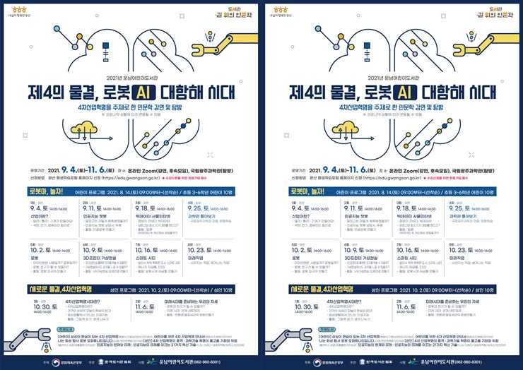 어린이 대상 프로그램 ‘로봇아, 놀자!’는 9월4일부터 10월23일까지 강연 7회, 탐방 1회로 총 8회가 진행되며, 성인 프로그램 ‘새로운 물결, 4차 산업혁명’은 10월30일부터 11월6일까지 강연 1회, 후속모임 1회로 총 2회가 진행된다. 강연과 후속모임은 코로나19 상황을 고려하여 온라인 비대면 프로그램(ZOOM)을 이용한다.