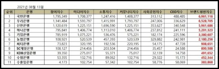 ‘8월 은행 브랜드평판’ 빅데이터분석 순위는 국민은행, 우리은행, 신한은행, 하나은행, 기업은행, 농협은행, 씨티은행, SC제일은행, KDB산업은행, 수협은행, 수출입은행 순으로 나타났다.