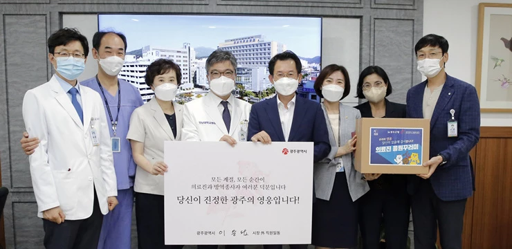 광주광역시청은 지난 18일 이용섭 시장을 대신해 문영훈 기획조정실장이 병원장실을 방문해 ‘모든 계절, 모든 순간이 의료진과 방역종사자 여러분 덕분입니다/당신이 진정한 광주의 영웅입니다’라고 씌여진 메시지와 함께 다양한 먹거리와 물품이 담긴 응원꾸러미 120개를 전달했다.
