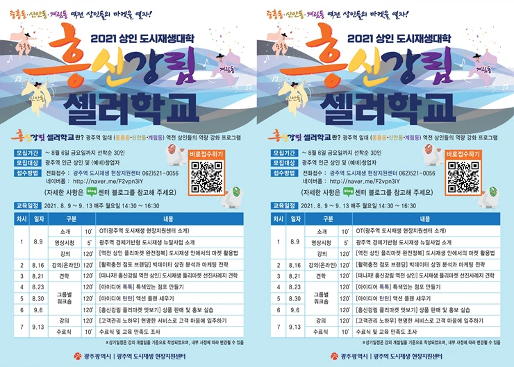흥신강림 셀러학교는 북구 중흥동, 신안동, 계림동 등 광주역 인근 상인과 예비창업자 등 30여 명을 대상으로 온라인으로 상권 분석, 마케팅 전략, 홍보 마케팅, 고객관리 등을 교육하며, 이를 통해 상가 경쟁력 강화와 매출 증대 방안을 함께 모색한다는 계획이다.