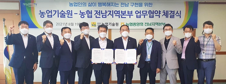 농협전남지역본부(본부장 박서홍)는 19일 전라남도농업기술원(원장 박홍재)과 디지털농업 활성화와 농업인의 삶이 행복해지는 전남농업을 구현하기 위한 업무협약을 체결하였다.