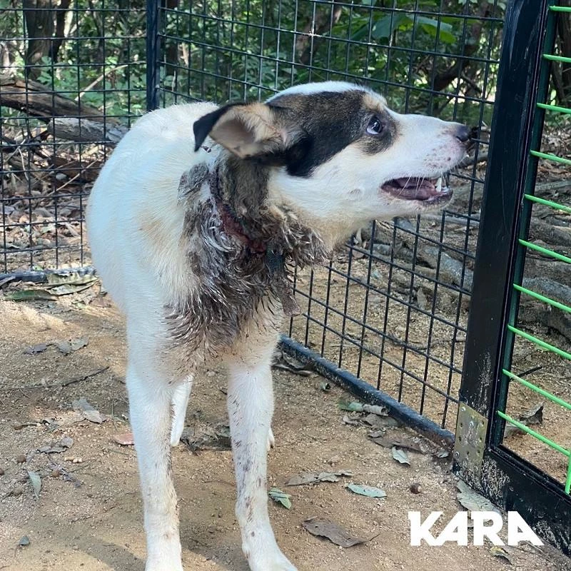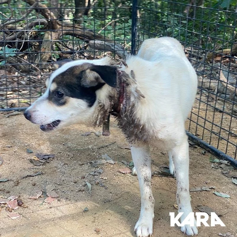 산채로 목이 썩어가던 강아지가 동물단체에 의해 구조됐다.