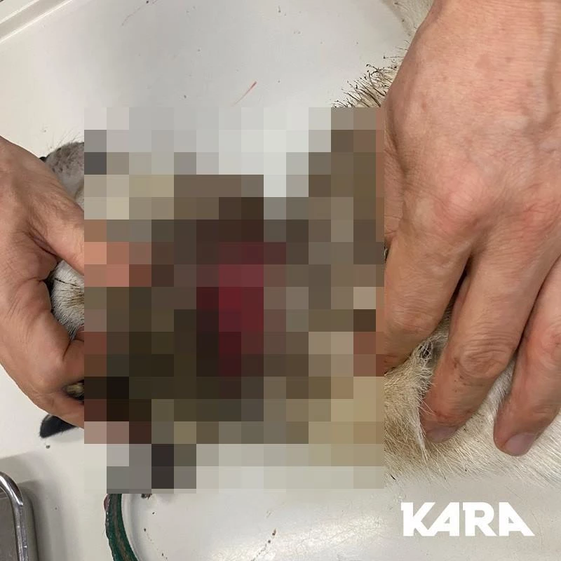 결국 견주는 동물권행동 카라에 도움을 요청했다. 현장을 방문한 카라 활동가들은 포획 틀을 설치, 복덩이를 구조해 동물병원 치료를 받게 했다. 상처가 생각보다 심각해서 복덩이는 수술을 마치고도 입원한 상태로 지내고 있다.