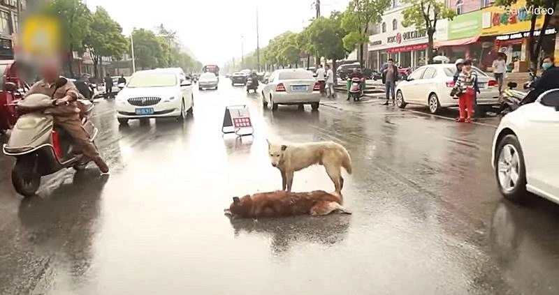 비가 내리던 어느 날, 갈색 털의 중형견 한 마리가 도로를 건너다 차에 치였다. 심한 충격을 받은 개는 그 자리에서 즉사했다. 하지만 사체가 도로 위에 있고 비까지 내려 아무도 수습하지 않았다.