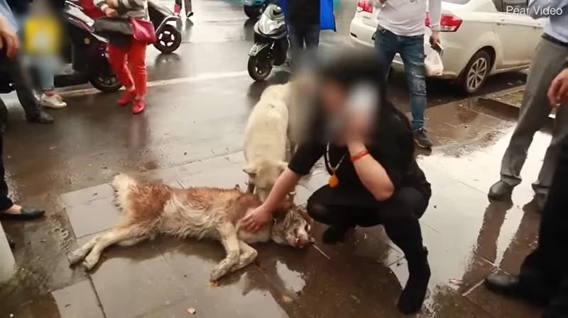 시간이 얼마나 지났을까. 죽은 개의 주인이라고 주장하는 여성이 등장했다. 여성은 공안의 도움을 받아 사체를 인도로 옮겼다. 그 와중에도 크림색 개는 죽은 친구와 떨어지지 않으려고 여성에게 바짝 달라붙었다.