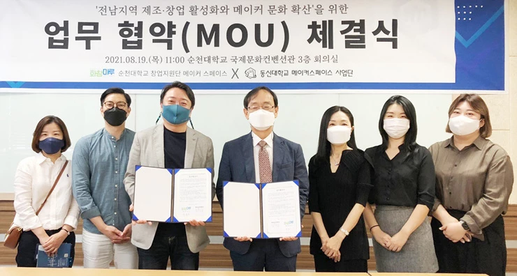 이를 위해 순천대 메이커스페이스 ‘화창마루’와 ‘전남지역 제조‧창업 활성화와 메이커 문화 확산을 위한 업무협약’을 체결하고 ▲전문 메이커 교육 프로그램 운영 ▲진로 및 취업 교육 ▲예비창업자 발굴 ▲제조‧창업 지원 ▲프로그램 기획‧운영‧네트워크 등을 위해 힘을 모으기로 했다.