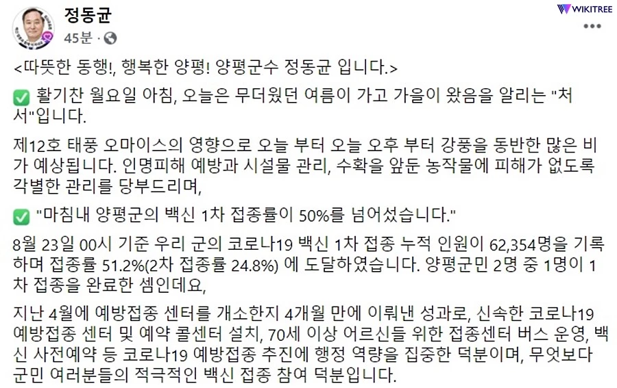 정동균 양평군수는 23일 오전, "마침내 양평군의 백신 1차 접종률이 50%를 넘어섰다"는 글을 자신의 페이스북 계정을 통해 공지했다.