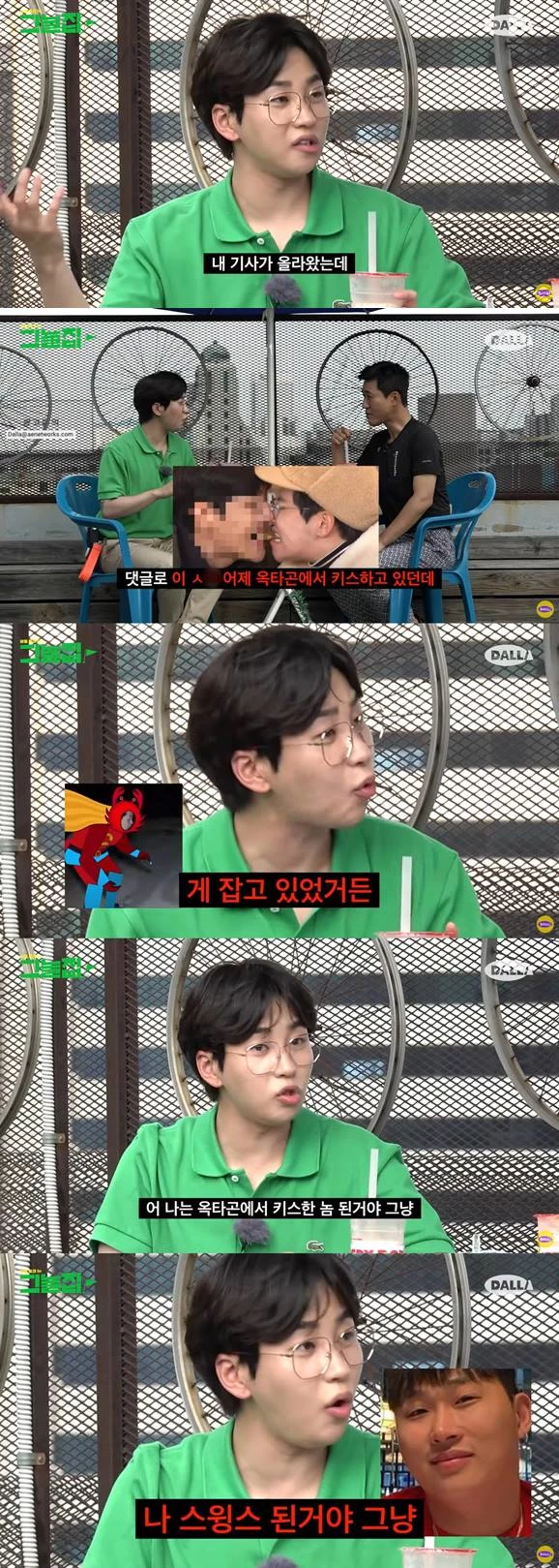 이날 김종민은 딘딘에게 "너 최근에 증산역에 간 적 있냐. 어떤 작가분이 봤는데 일진들 모아놓고 뭐라고 했다고 하더라. 옆 테이블에서 먹었다더라. 남자들이 와서 인사하고 그랬다더라"라고 설명했다.
