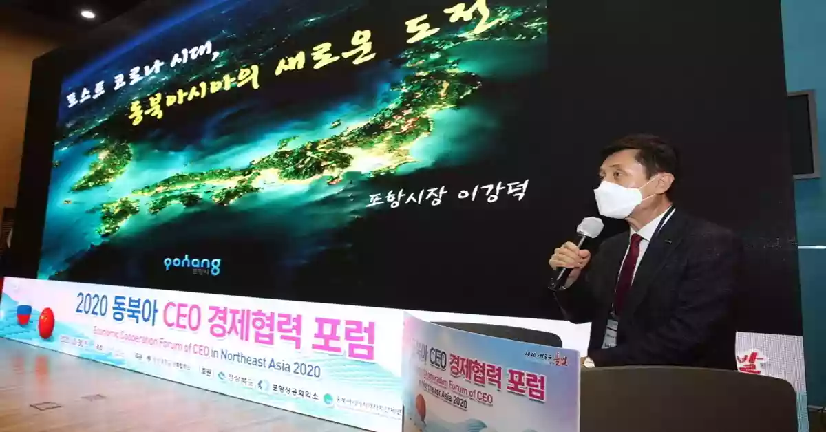 2020 동북아 CEO 경제협력 포럼에서 인사말을 하고 있는 이강덕 포항시장 / 포항시 제공