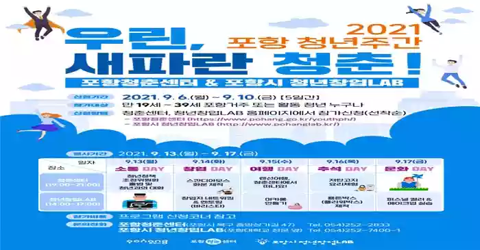 시는 13일부터 17일까지 '2021년 포항청년주간' 으로 정하고 포항청춘센터와 포항시 청년창업LAB 등과 공동으로 오는 18일 ‘우린, 새파란 청춘’ 이란 슬로건으로 청년세대를 위해 다양한 행사를 진행한다고 밝혔다.