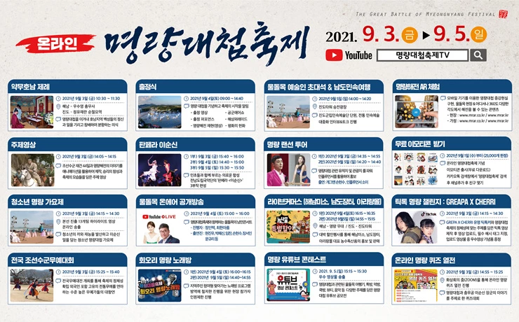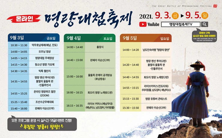 호국역사문화 축제인 2021 명량대첩축제가 코로나19 극복의 힐링 메시지를 담아 3일부터 5일까지 온라인으로 개최된다.