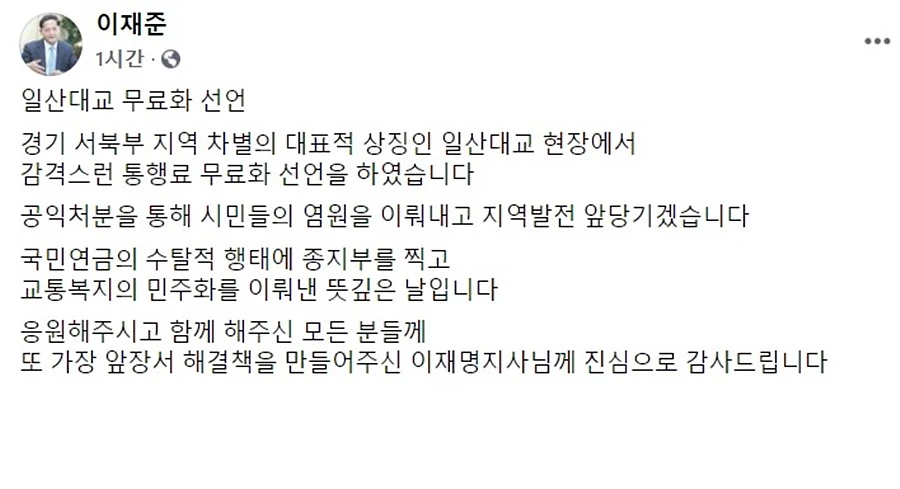 이 시장은 이날 자신의 페이스북 계정을 통해 "경기 서북부 지역 차별의 대표적 상징인 일산대교 현장에서 감격스런 통행료 무료화 선언을 했다"고 언급했다.