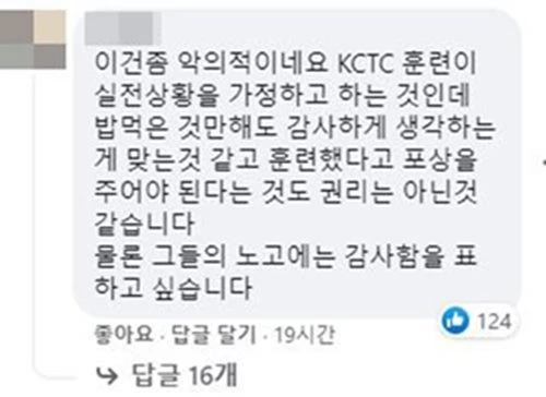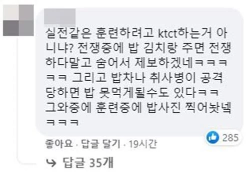 누리꾼들은 의견이 갈렸다. 일부 누리꾼은 "KCTC는 실전을 가정하는 것이다", "전쟁 중에 밥과 김치만 주면 숨어서 제보할 거냐", "훈련 중에 사진은 어떻게 찍은 거냐" 등 제보자를 향해 비판의 목소리를 냈다.