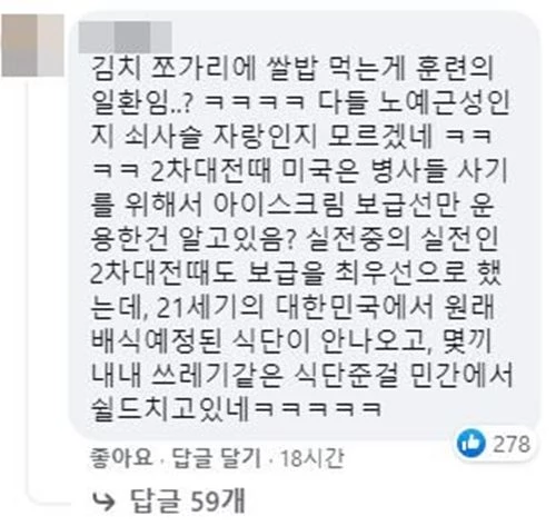 다른 누리꾼들은 "억지로 끌려가서 훈련받는데 쌀과 김치만 먹으면 누구나 폭발한다", "빈곤하게 먹는 게 훈련의 일환이냐" 등 제보자를 옹호했다.