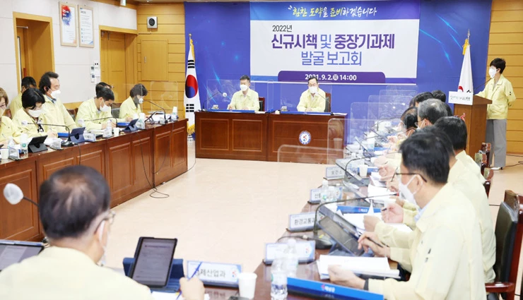 해남군은 2022년 신규시책 및 중장기과제 발굴보고회를 갖고, 행정환경 변화 속에서 코로나19를 극복하고 도약을 준비하는 해남군의 미래 비전을 모색했다.
