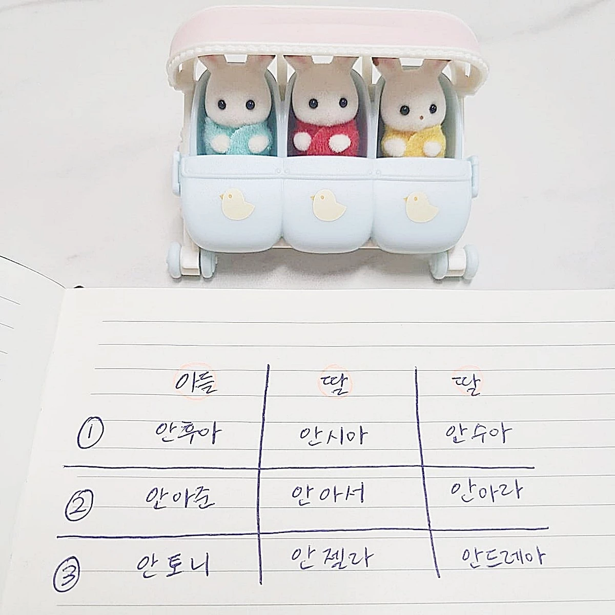 다음은 황신영이 올린 세쌍둥이 이름 3가지다. 1번은 안후아(아들), 안시아, 안수아다. 2번은 안아준(아들), 안아서, 안아라다. 3번은 안토니(아들), 안젤라, 안드레아다.