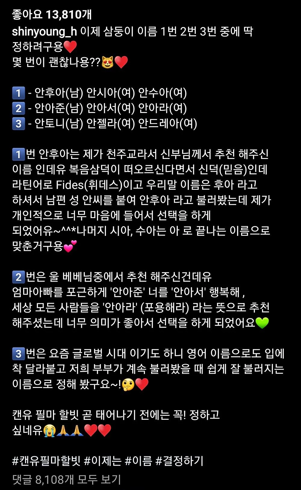 황신영은 "이제 삼둥이(세쌍둥이) 이름 1번, 2번, 3번 중에 딱 정하려고요. 몇 번이 괜찮나요? 곧 태어나기 전에는 꼭 정하고 싶네요"라고 말했다.