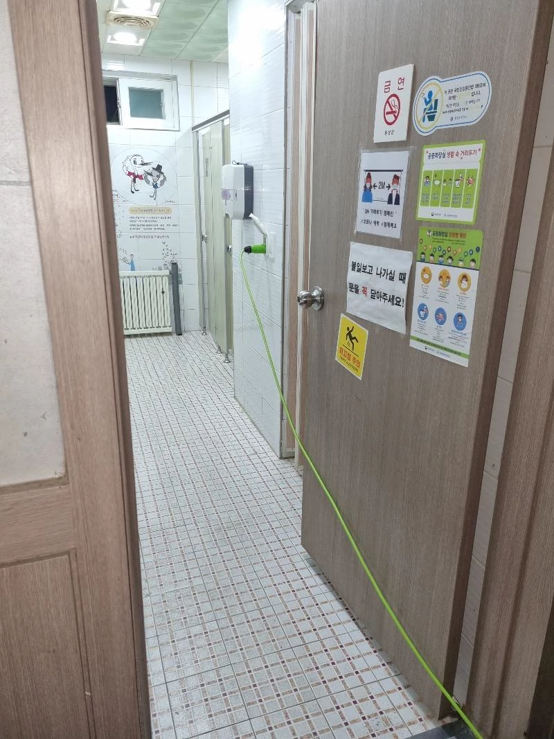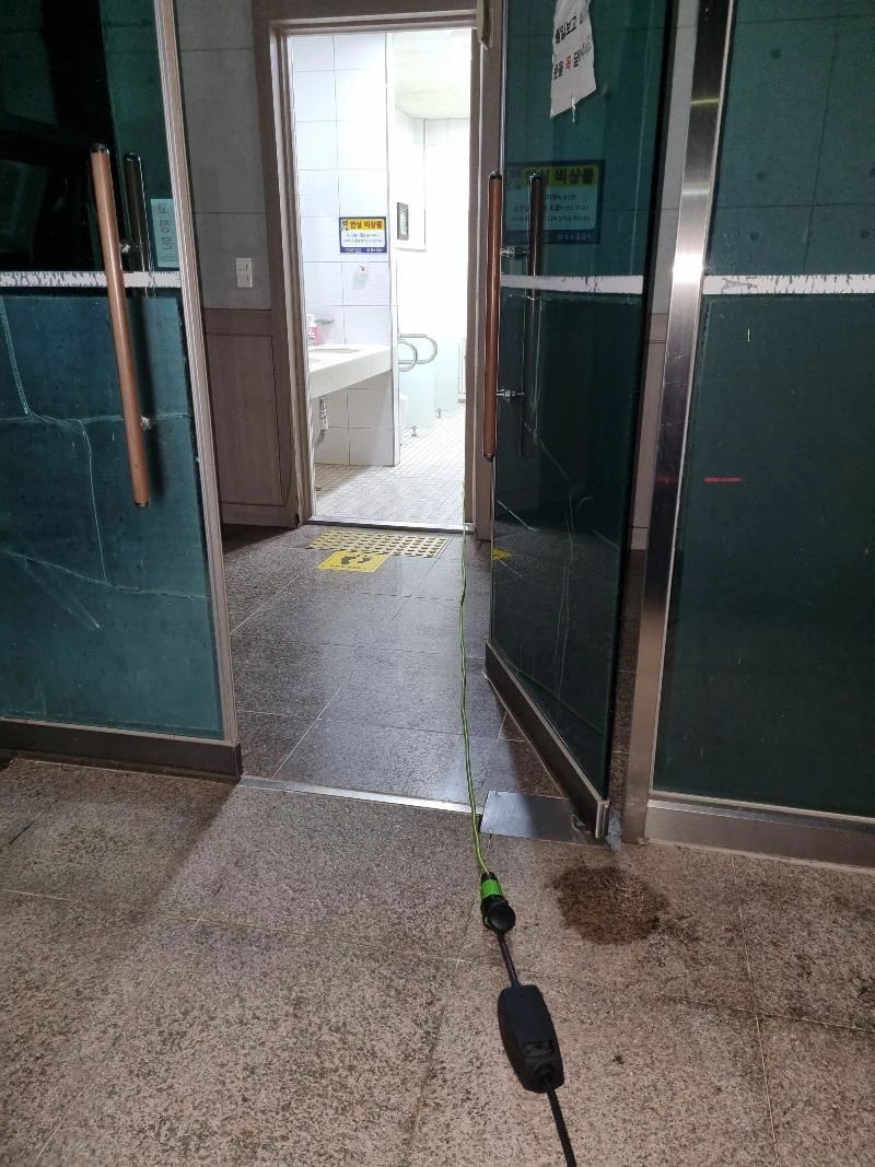충전 선을 따라가 보니 안에 있는 공중화장실 콘센트에 연결돼 있었다. 길이가 모자랐는지 연장선까지 들고 와 충전 중이었다.