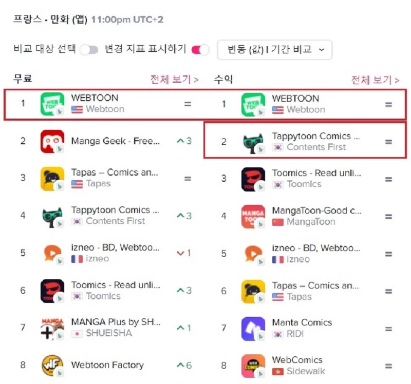 네이버웹툰이 투자한 콘텐츠퍼스트의 태피툰도 프랑스 구글플레이 만화 부문 매출 순위에서 2위를 차지하며 활약하고 있다.
