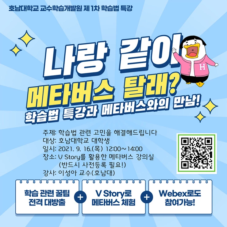 호남대 교수학습개발원(원장 장윤경)은 오는 9월 16일 ‘학습법 관련 모든 고민을 해결해드립니다’라는 주제로 이성아 전담교수의 진행을 통해 V Story에 구축된 호남대학교 교수학습개발원 강의실 참여 학생들과 학습 관련 고민과 이에 대한 학습 전략을 논의할 예정이다.