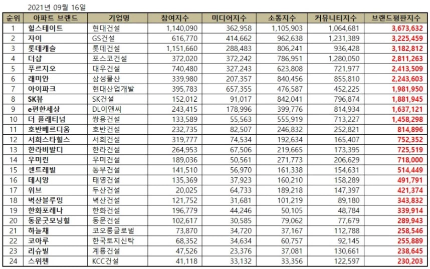 아파트 ‘9월 브랜드평판' 순위가 발표돼 눈길을 끌었다.
