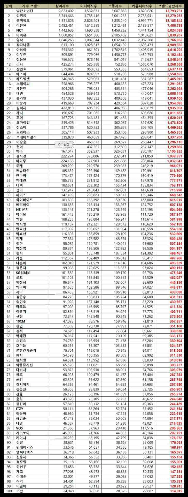 다음은 9월 가수 브랜드평판 빅데이터 분석 결과를 담은 그래프와 표다.