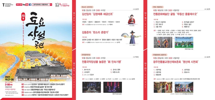 10월에도 판소리·산조무대·국악창작무대·무용무대 등 ‘전통문화관 토요상설공연’을 유튜브와 페이스북 생중계로 누구나 안전하게 즐길 수 있다.