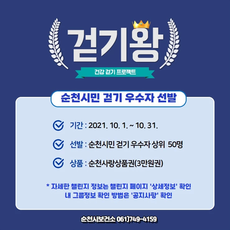 10월 1일부터 31일까지 한달간 운영되는 순천시민 걷기왕 챌린지는 한달동안 최대 누적 걸음수를 달성한 상위 50명을 선발해 순천사랑상품권(3만원)을 증정한다. 부정한 방법을 사용하는 참여자는 참여 제한 및 탈퇴 처리가 되며, 이들을 색출하기 위해 상시 모니터링을 실시할 계획이다.
