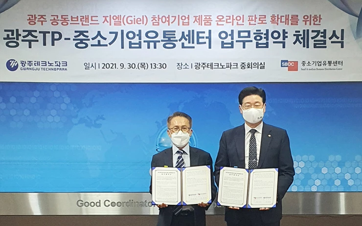 광주테크노파크(원장 김선민)가 중소기업유통센터(대표이사 정진수)와 9월 30일 광주테크노파크 중회의실에서 광주공동브랜드 지엘(GIEL) 참여기업 제품의 온라인 판로 지원을 위한 업무협약을 체결하였다.